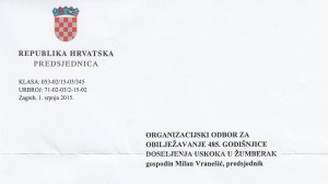 Predsjednica RH uputila pismo Organizacijskom odboru nadolazeće uskočke proslave Predsjednica Republike Hrvatske gđa. Kolinda Grabar Kitarović uputila je pismo Organizacijskom odboru za obilježavanje 485. godišnjice doseljenja Uskoka u Žumberak. U pismu ur.broj 71-02-03/2-15-02, Predsjednica RH obraćajući se predsjedniku Organizacijskog odbora Milanu Vranešiću u pismu podrške navodi: ” Poštovani gospodine Vranešić, s velikim zadovoljstvom prihvaćam pokroviteljstvo…